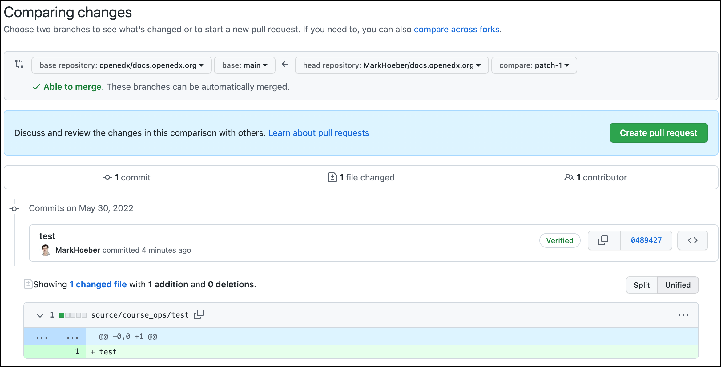 GitHub then prompts you to create a pull request, which is a request for the Open edX team to integrate changes in your fork into the official repository.