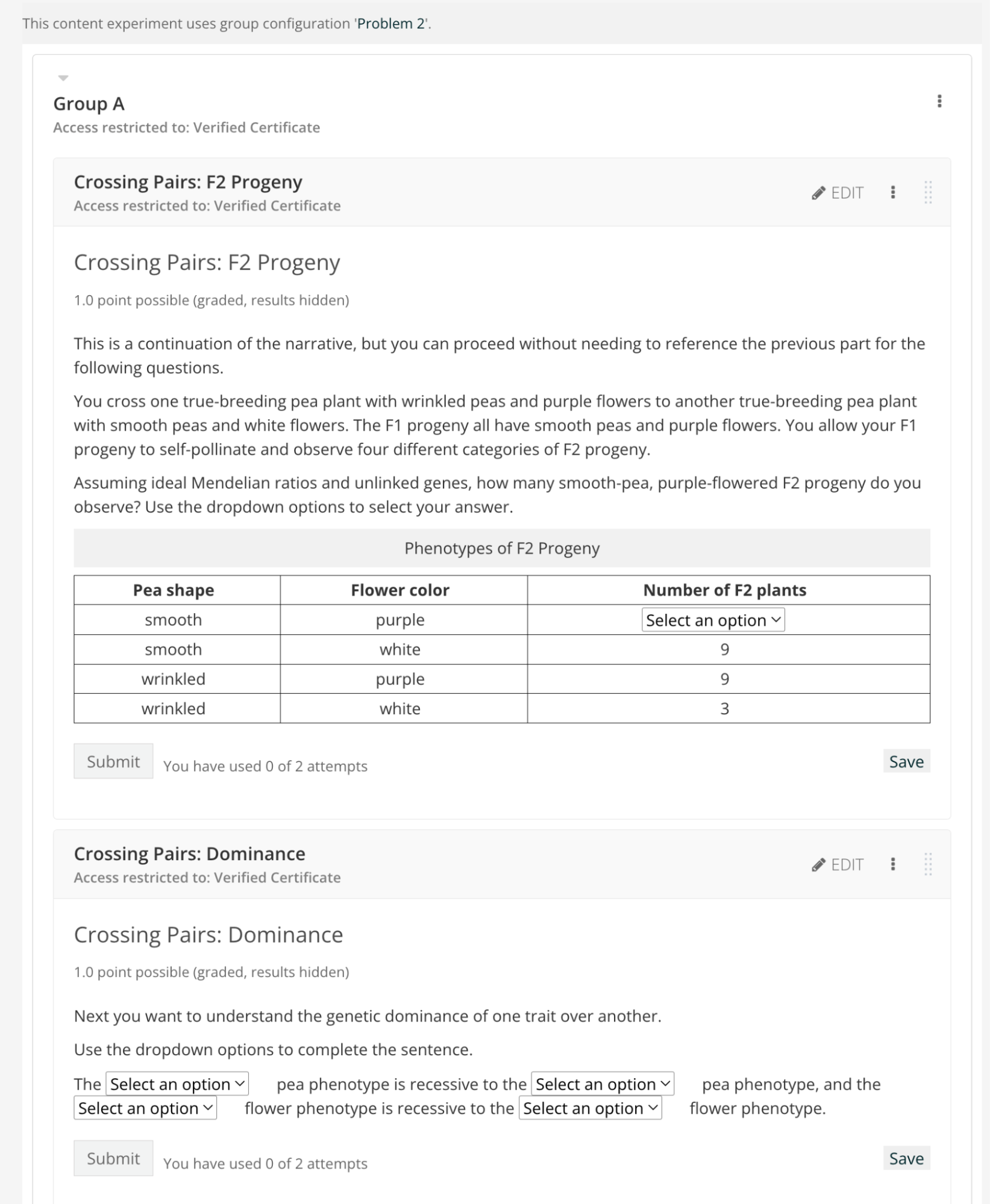 In this example use case, different learners encounter different versions of the same unit allowing multiple problem components or HTML components to stay together after randomization via the content experiment or split test. Each learner encounters a different version of each unit of the exam allowing exponentially different versions of the same exam. For example, in one extensive use case, a 25-unit exam using 4 different content experiment groups per unit has \(4^{25}\) different versions if you treat each unit as an independent randomization from the previous unit. This scenario would have 25 content experiments under the settings menu → group configurations in Studio. See Manage Content Experiments (how-to). This allows for all learners to receive similar summative assessments testing the same learning objectives but not having the same exam questions and answers as any other learner.