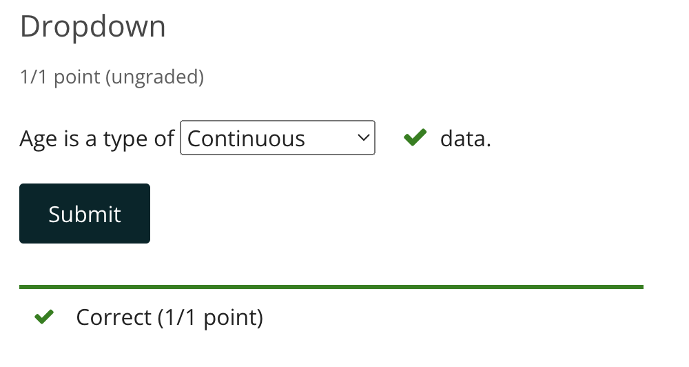 To revise the previous example to an in-line question, first rewrite the sentence for completion. Age is a type of _ data. For inline, the OLX looks like the following.