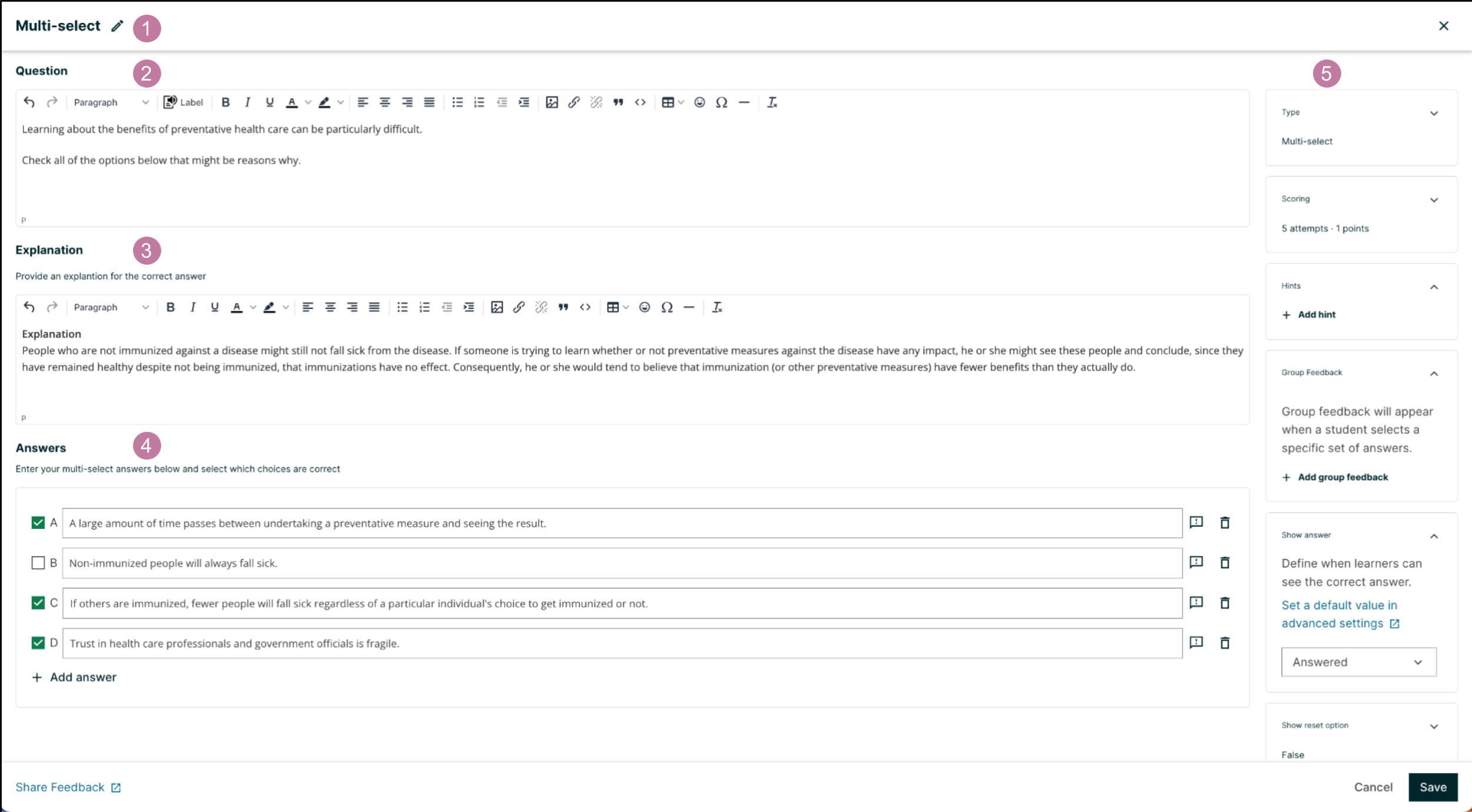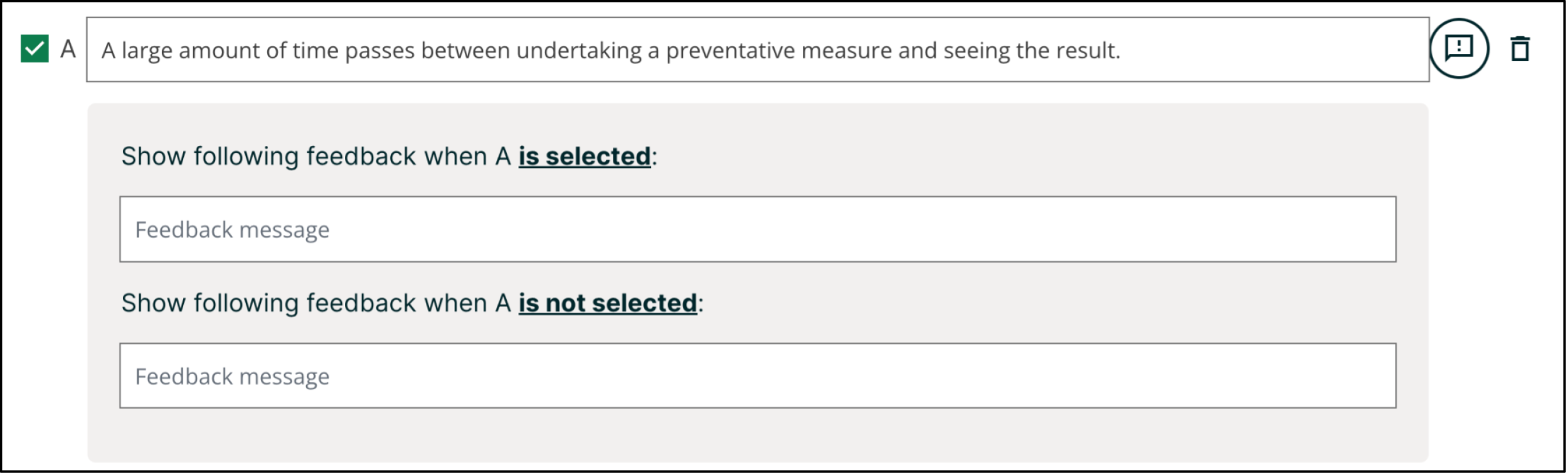 In multi-select problems, you can provide feedback for each answer that a learner can select, with distinct feedback depending on whether or not the learner selects that answer. This means that there are several possible types of feedback.