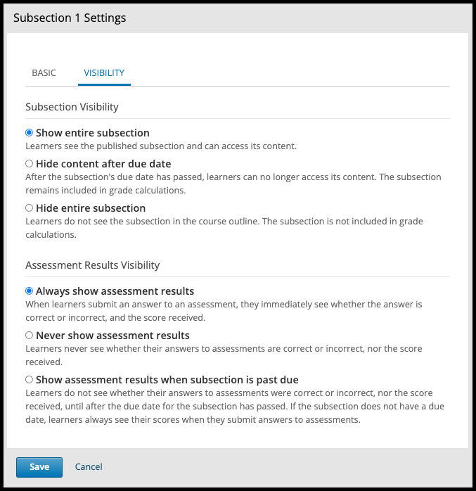 Subsections that are hidden in this way remain visible in the course navigation, and are included when grades are calculated. However, learners can no longer access the subsection’s content after the due date or the course end date.