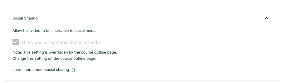 This is the default state for a course. The default state for a video is unshared. To change the sharing state for a video, click the edit option for the video and navigate to the Social Sharing section. This section of the editor will indicate if this video is shared and if the course or the video controls if it is shared or not.