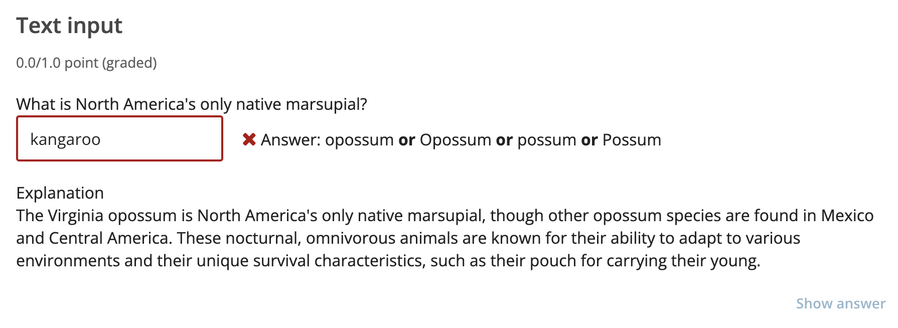 Explanation. You can include an explanation that appears when a learner selects Show Answer.
