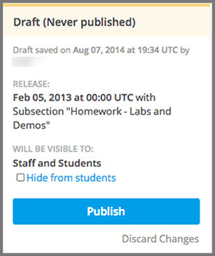 When you edit a published unit, whether or not it is released, the unit’s publishing status changes to Draft (Unpublished Changes), as shown in the status panel.