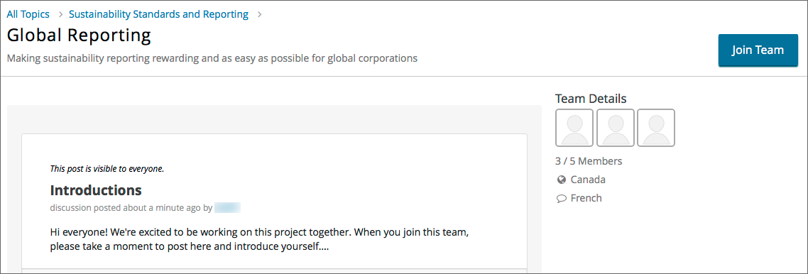 On the Team Details page, you can browse the team’s discussion posts, but you cannot participate unless you are a member of the team.
