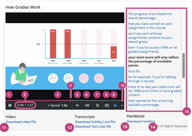 Most courses include videos, and the Open edX platform has its own video player. Most of the controls on the player will be familiar to you if you have watched online videos before. However, the Open edX video player has some extra features you may not have seen.