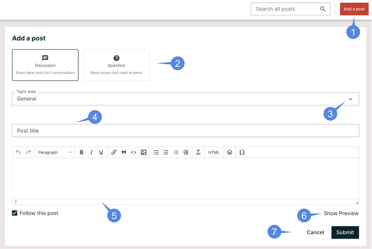 After you decide on a post type and topic, you can add your post on the Discussion page or in the body of the course.